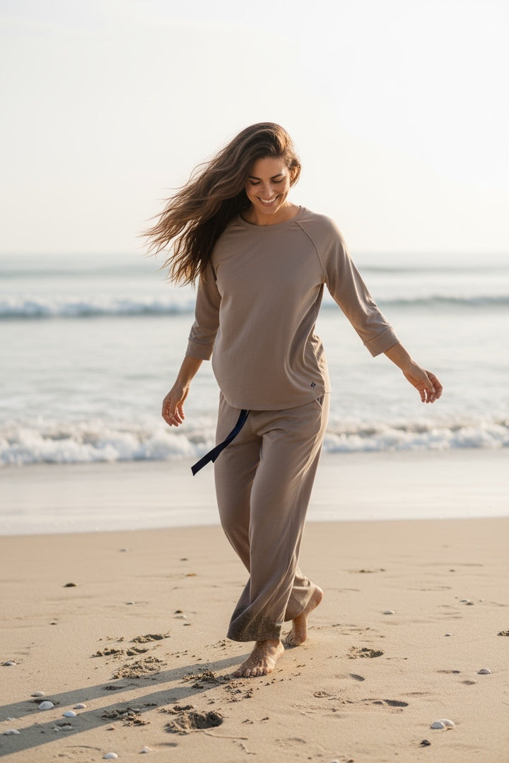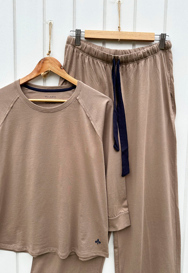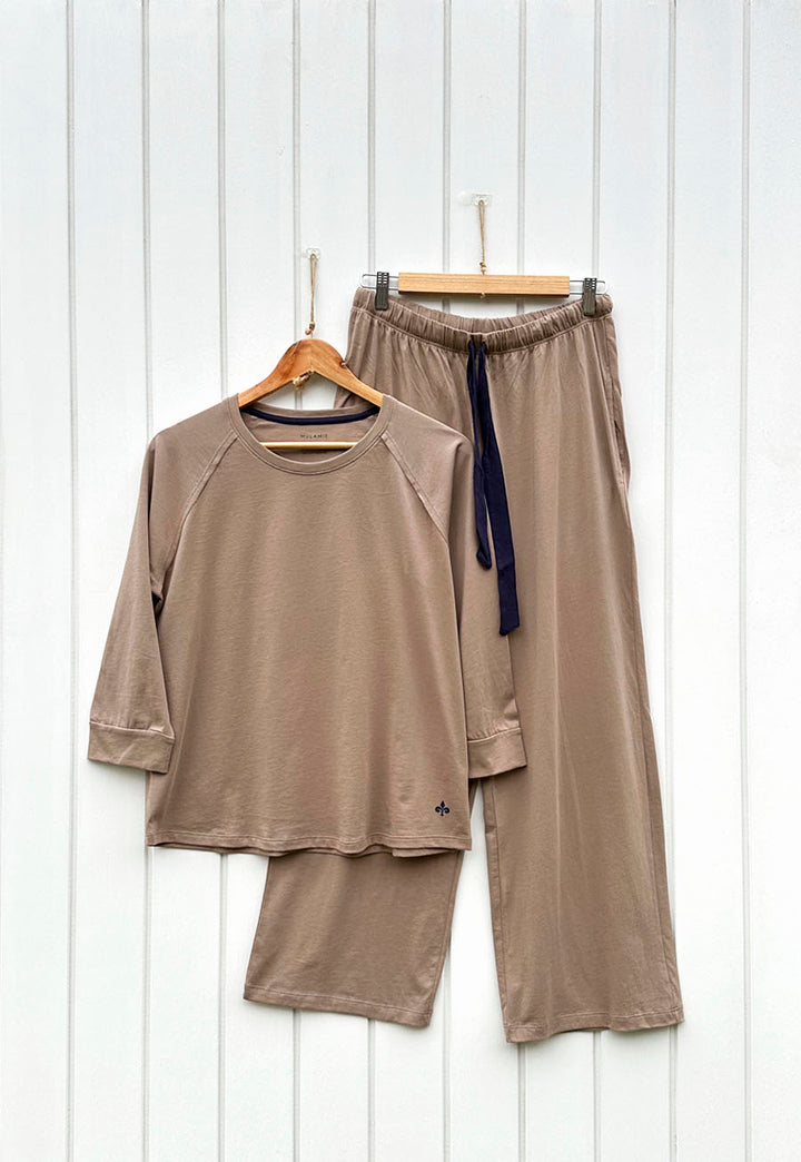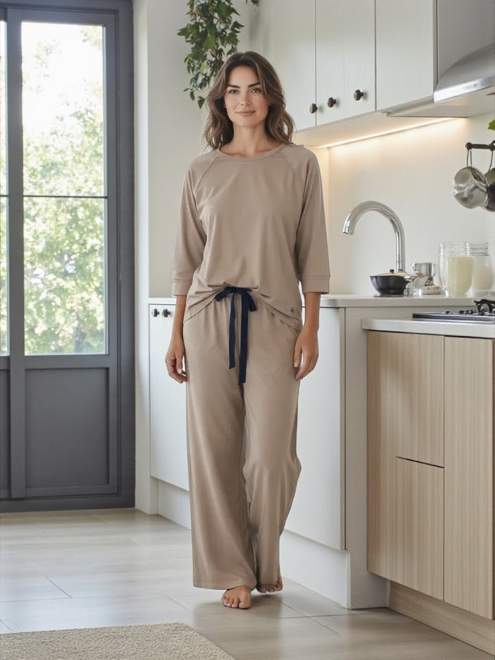 Pijama en algodón pima. Pantalón de pierna ancha, con bolsillos, elástico y cinta para ajustar. La remera es manga ranglan 3/4. es de color Camel.