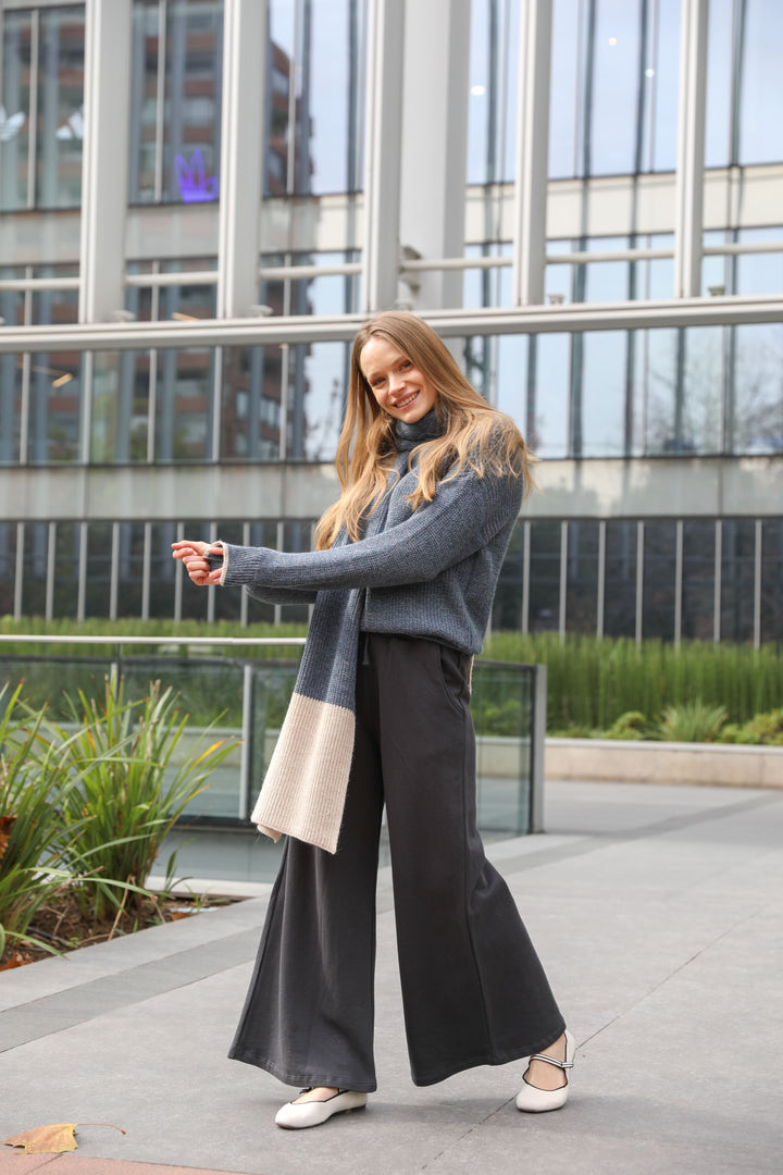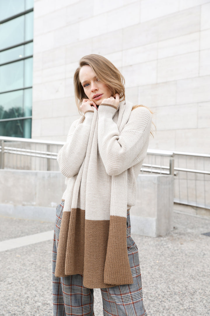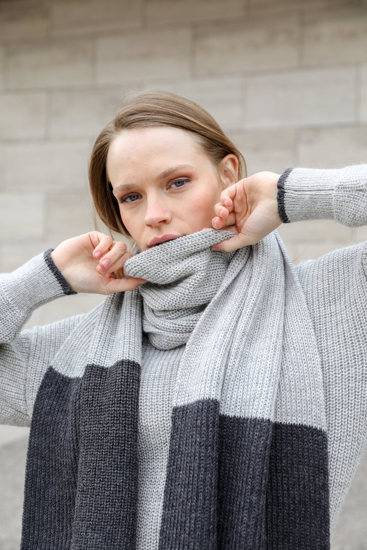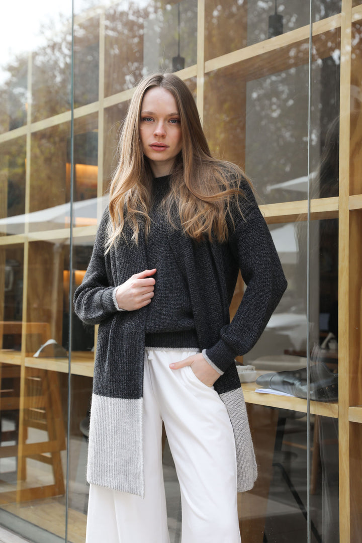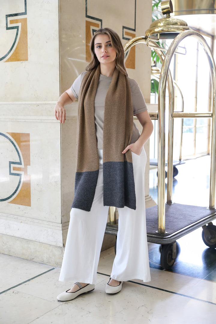 Confeccionada con una mezcla de 50% alpaca, 10% lana y 40% acrílico, ofrece una textura suave y abrigada, ideal para los días fríos. Su tamaño generoso permite múltiples formas de uso: como bufanda envolvente, chal o capa ligera.