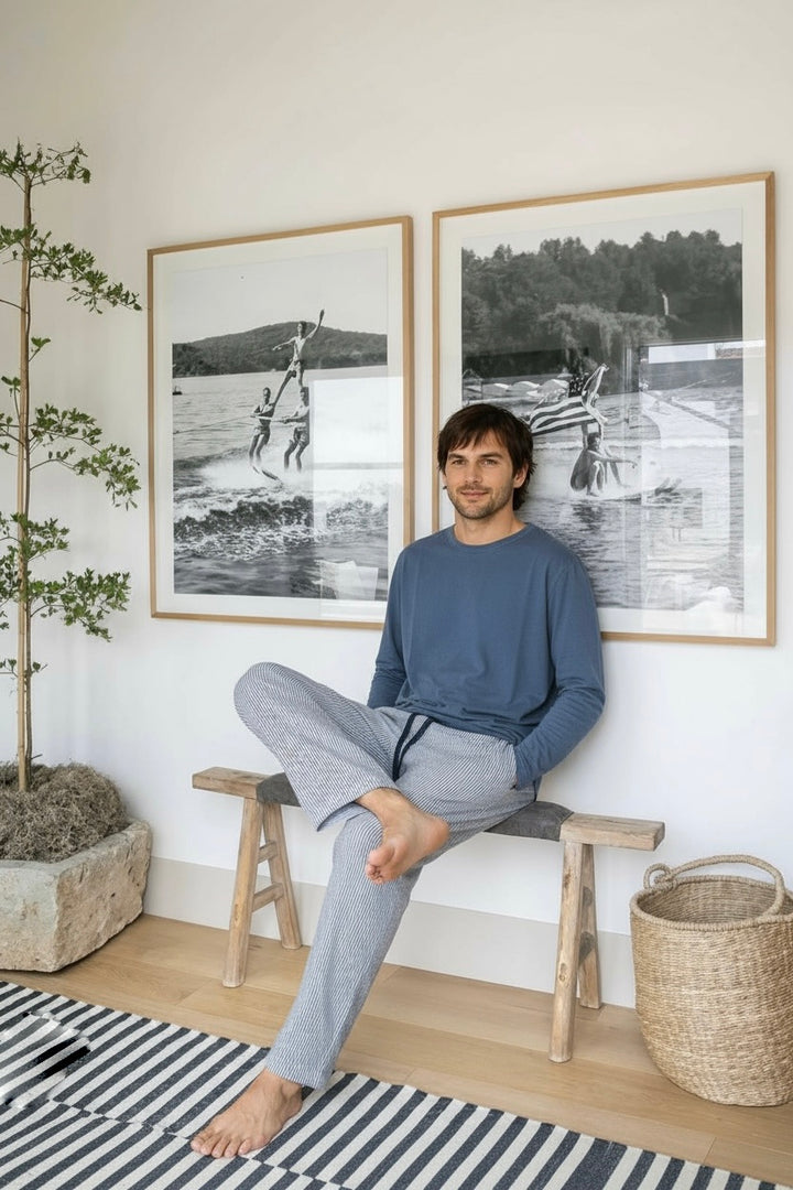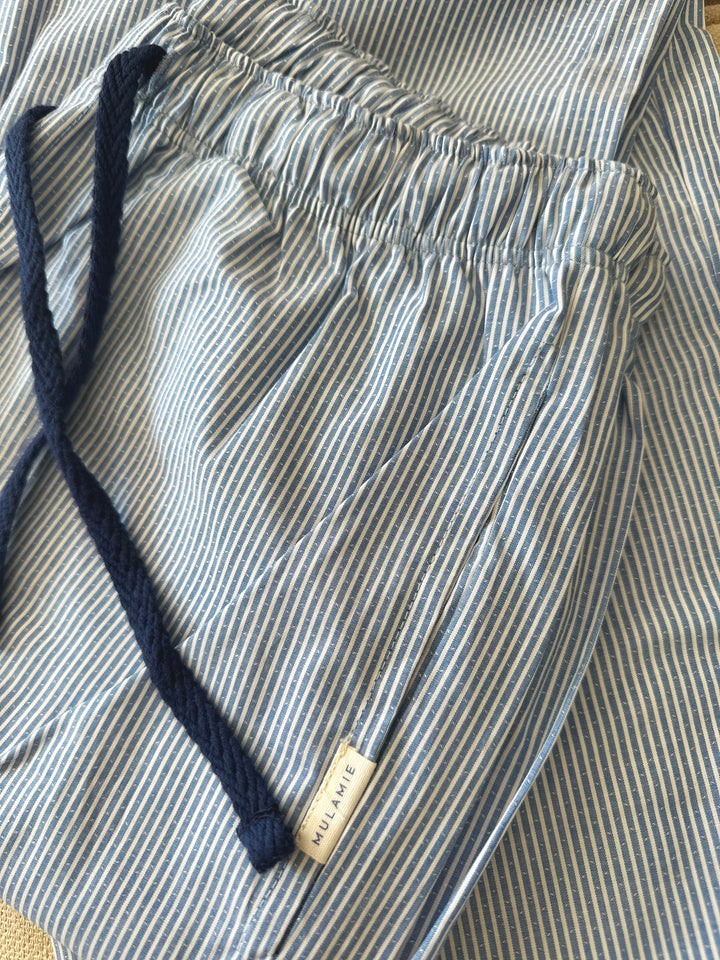 Pijama 100% Pima Cotton. El pantalón es de tela plana, y tiene bolsillos laterales. La cintura tiene elástico y un cordón en caso de que se necesite más ajuste.