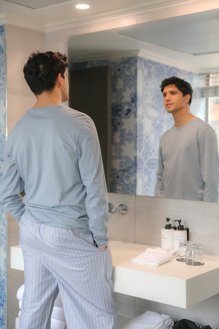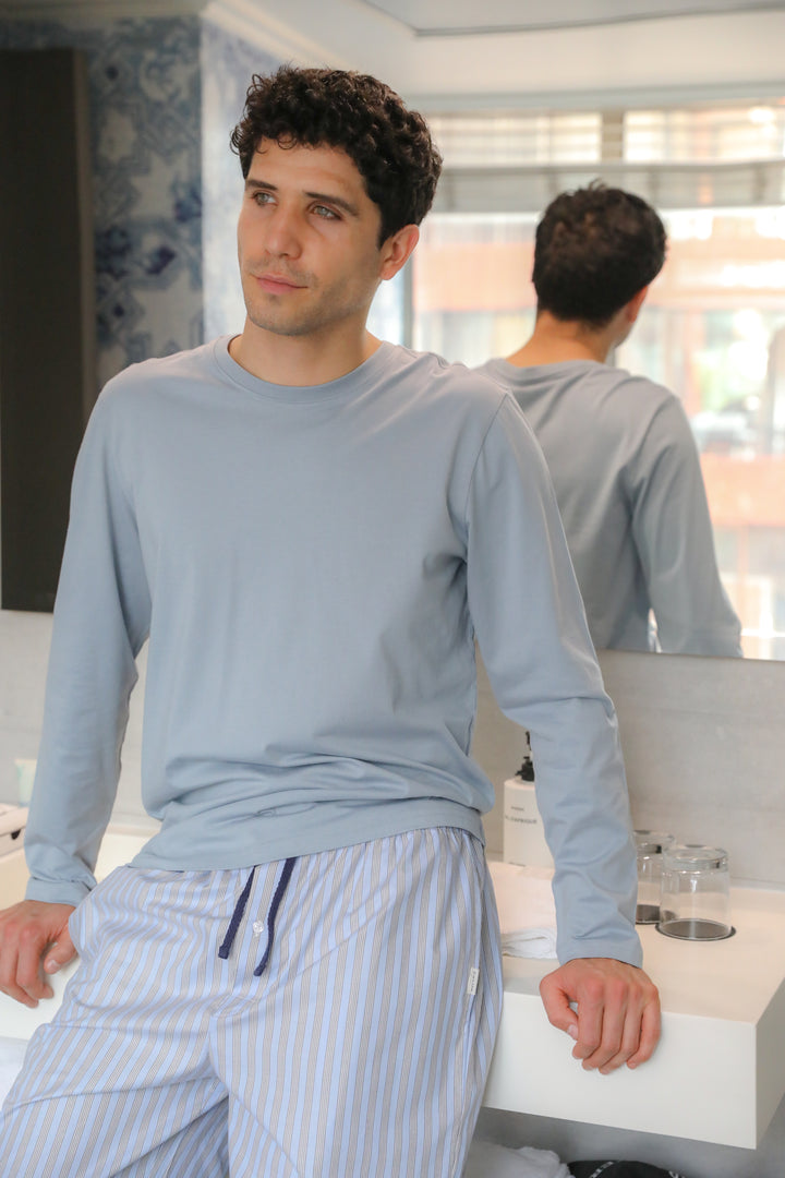 Pijama de algodón pima. El pantalón es de tela plana (materia prima algodón pima), tiene elástico en la cintura y cordón en caso de que se quiera mayor ajuste. Tiene bolsillos y su moldería es amplia.