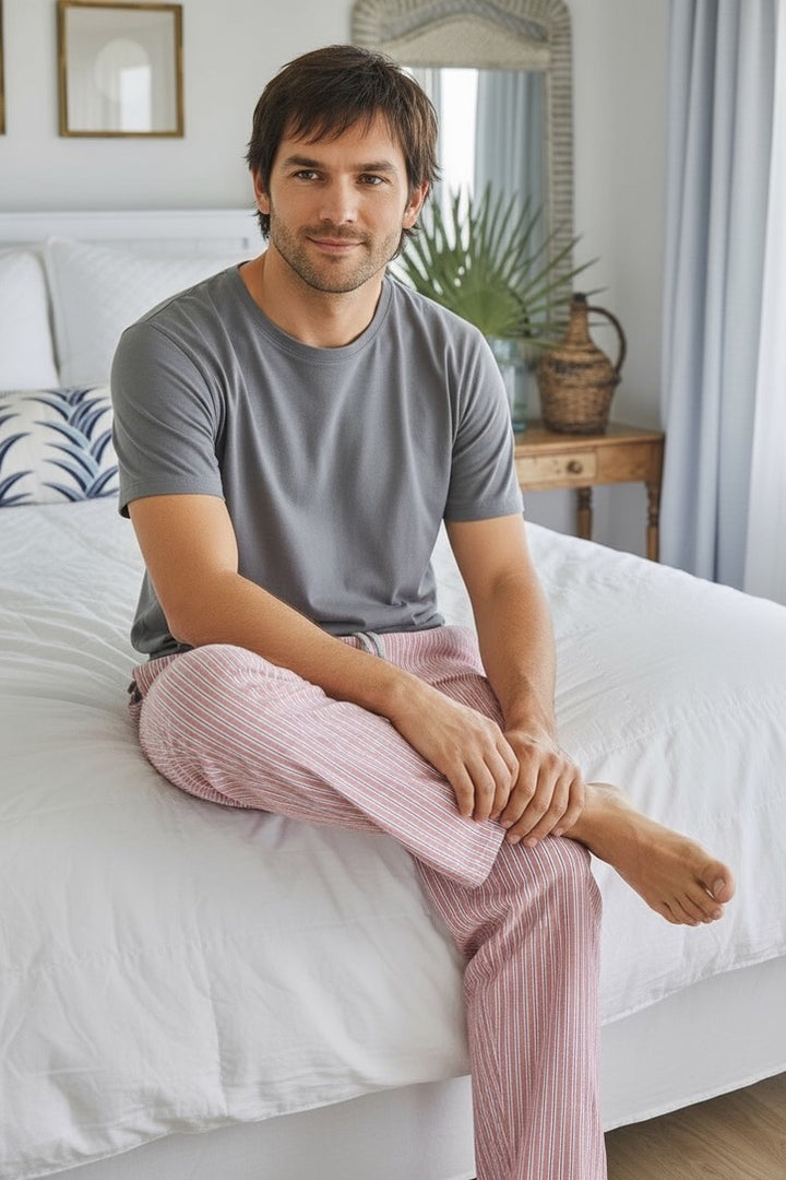 Pijama de algodón pima. Pantalón de tela plana rayada con cintura con elástico y cordón en caso de necesitar mayor ajuste. Tiene Bolsillos laterales. y su molderia es amplia y cómoda. El tshirt es de manga corta en color gris.