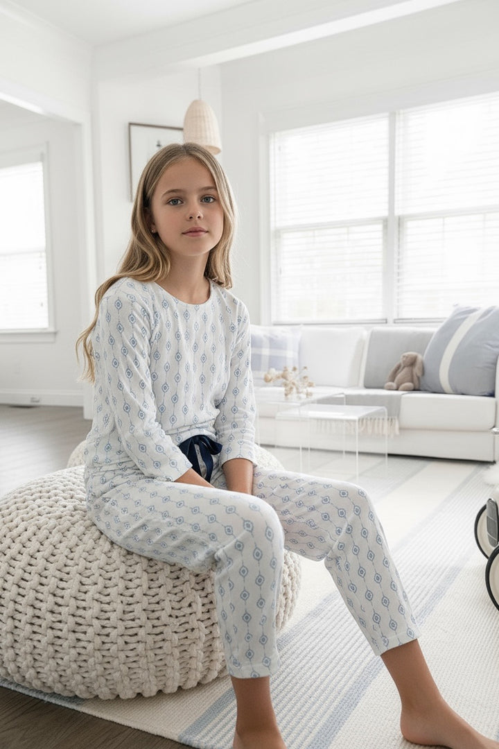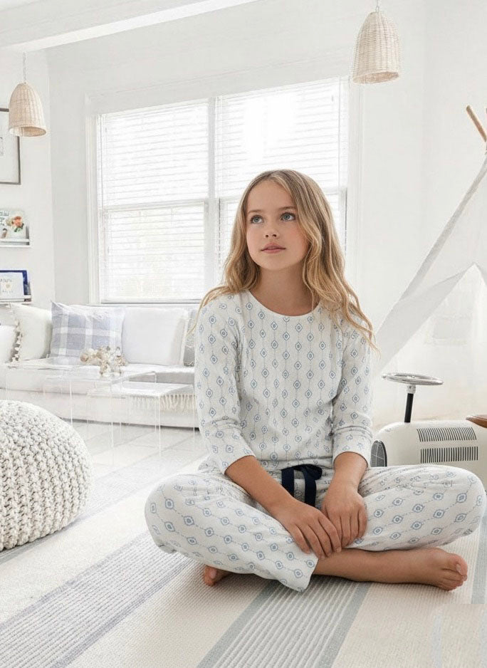 Pijama estampado con pantalón de tiro alto y pierna skinny, cintura con elástico y cordón azul. Polera de manga 3/4 y cuello bote. La moldería se adapta al cuerpo y con el uso se vuelve más suelta.