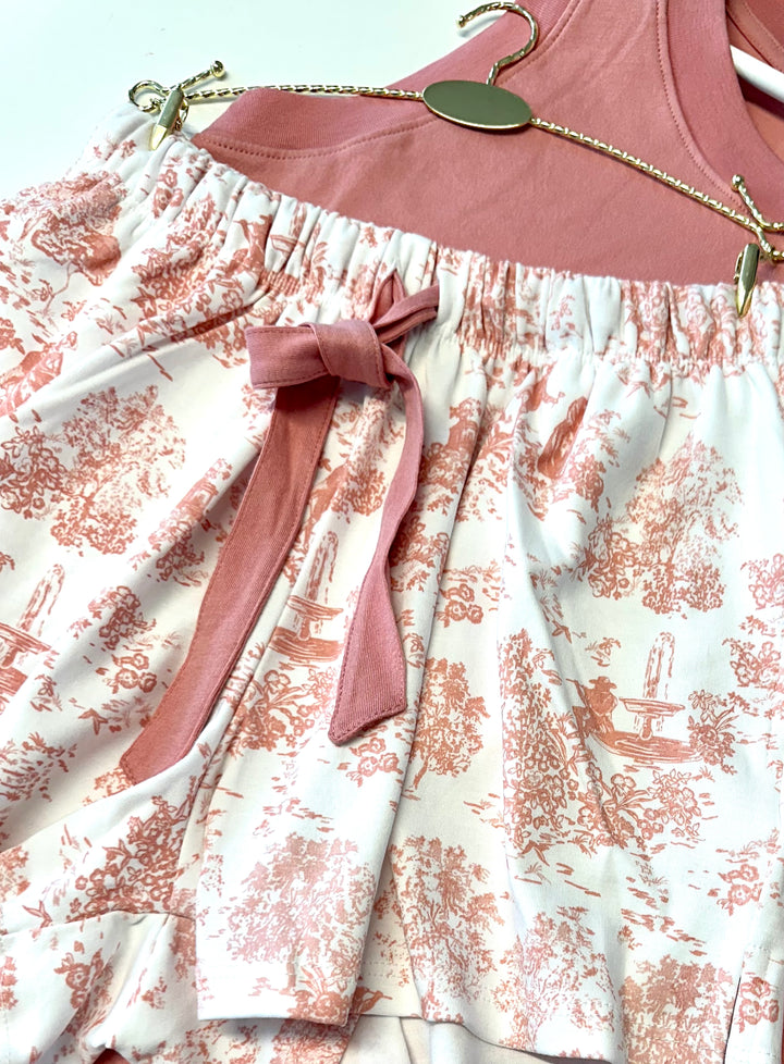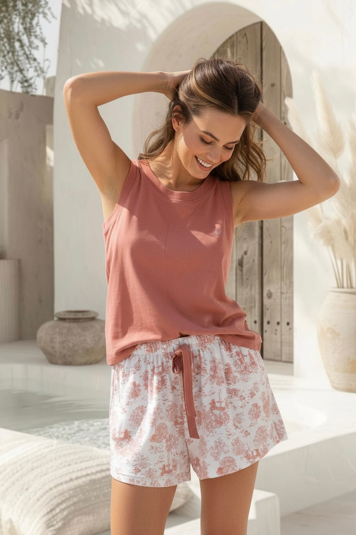 Pijama confeccionado en algodón pima peruano. El short, con estampa Toile de Jouy, cuenta con bolsillos laterales, elástico en la cintura y moldería amplia. La polera, lisa y clásica.