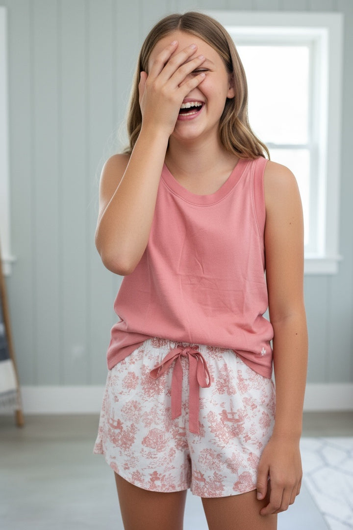 Pijama confeccionado en algodón pima peruano. El short, con estampa Toile de Jouy, cuenta con bolsillos laterales, elástico en la cintura y moldería amplia. La polera, lisa y clásica .