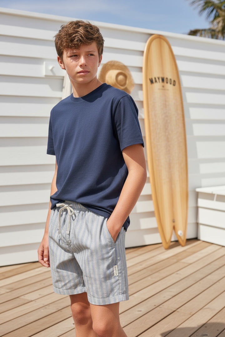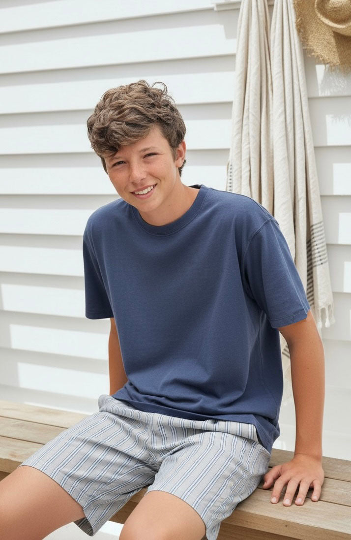 Pijama en algodón pima, con remera de jersey pima y short cde genero pima con bolsillos.
