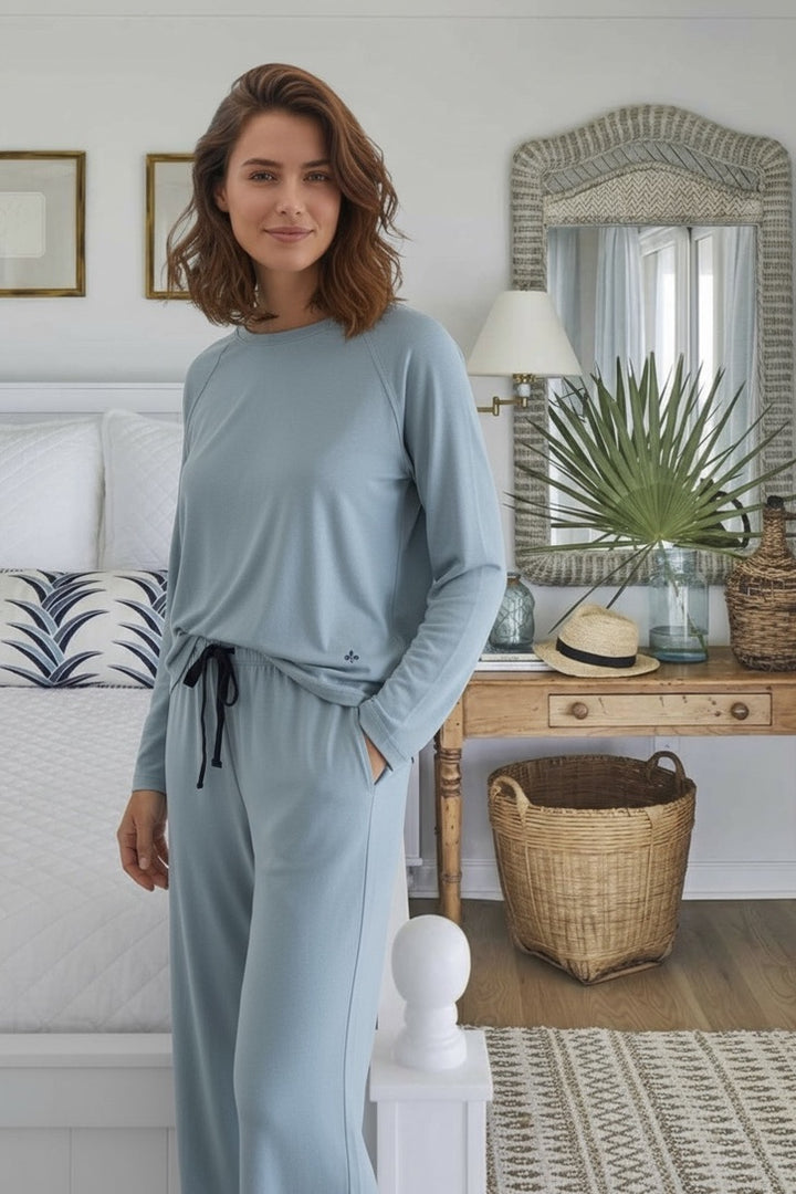 Relajado, suave y súper cómodo. Su moldería amplia ofrece libertad de movimiento, con pantalón que incluye bolsillos funcionales, elástico y cordón ajustable en la cintura. La remera es de manga larga.