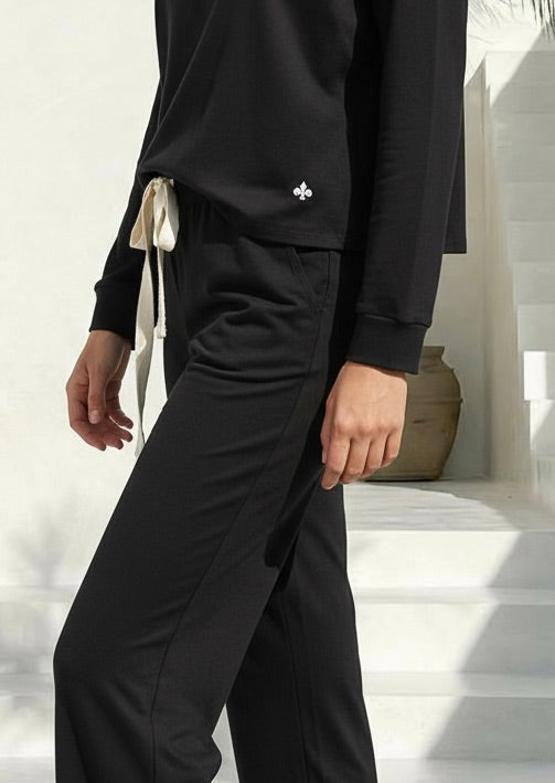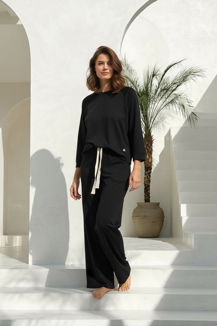 Relajado, suave y súper cómodo. Su moldería amplia ofrece libertad de movimiento, con pantalón que incluye bolsillos funcionales, elástico y cordón ajustable en la cintura. La remera es de manga larga.