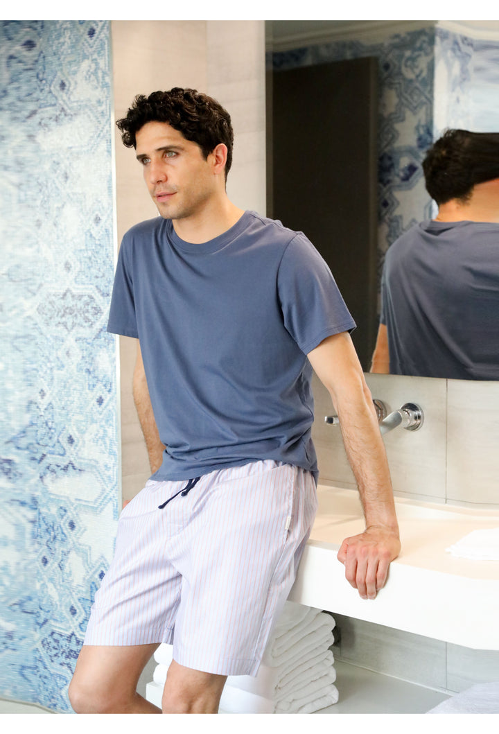 Pijama corto en algodón pima 100%. short de tela plana (es como tela de camisa el short) con bolsillos y elástico y cordón en cintura. Remera lisa manga corta.