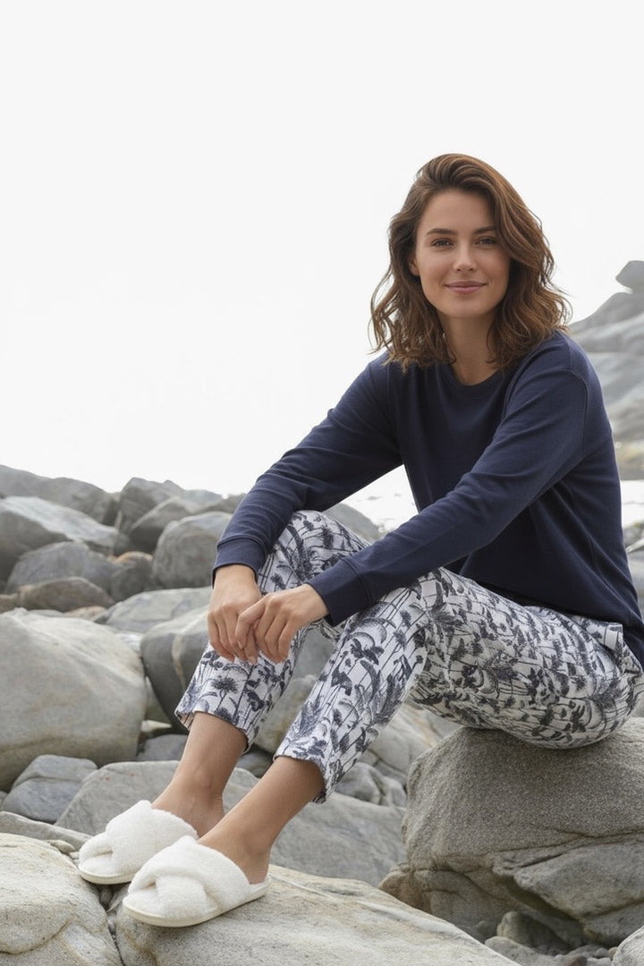 La parte superior incluye una remera de manga larga, suave, amplia y cómoda. El pantalón largo estampado, con bolsillos funcionales, ofrece un ajuste relajado y práctico