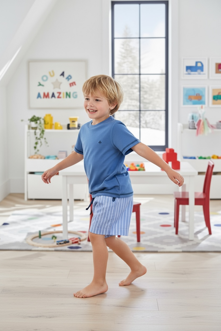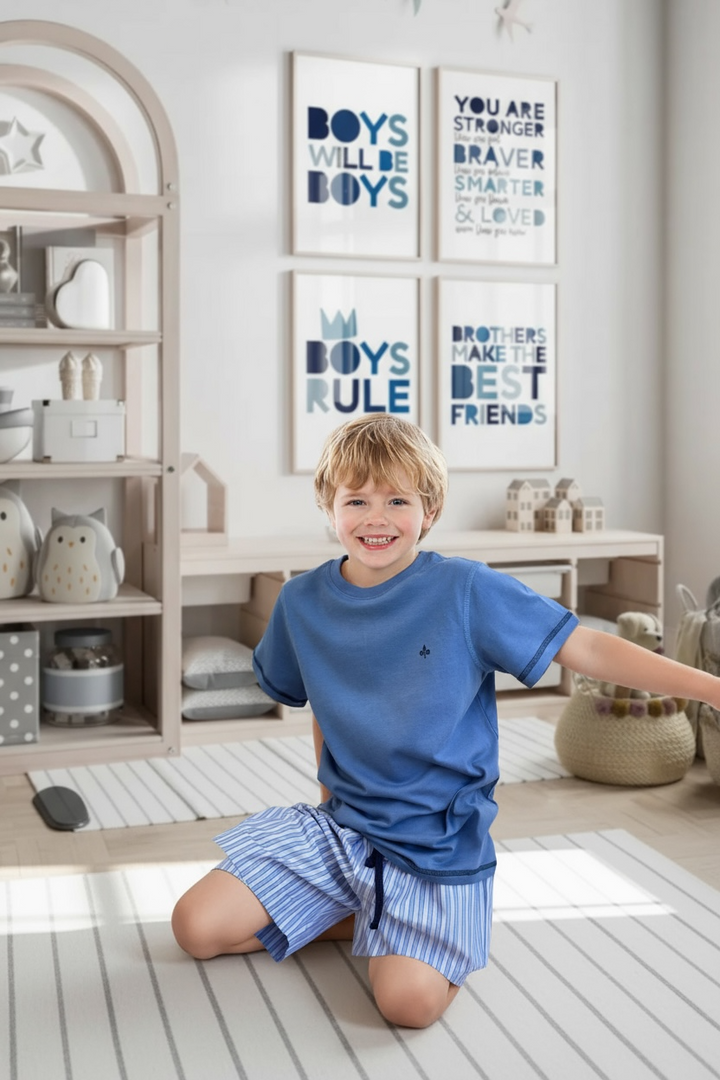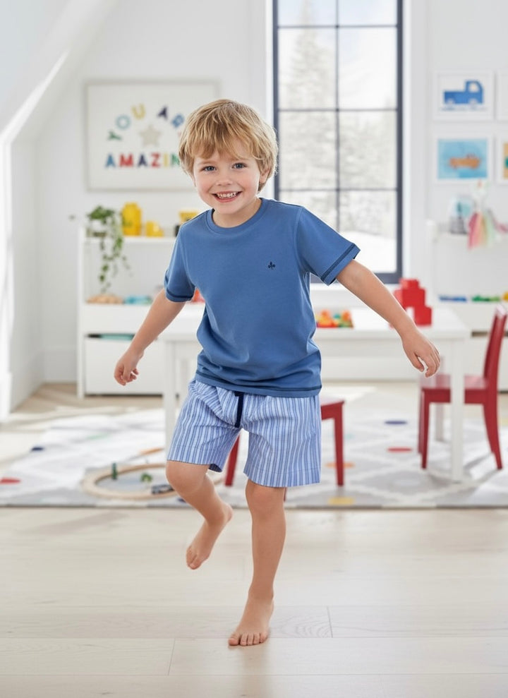 Pijama con remera de algodón pima 100% y short en tela plana del mismo material. A partir del talle 12, los shorts incluyen bolsillos. Perfectos para combinar padre e hijo con el mismo estilo.