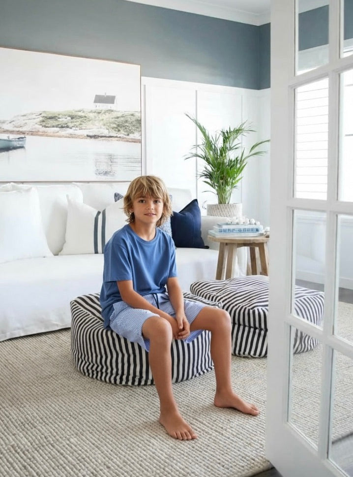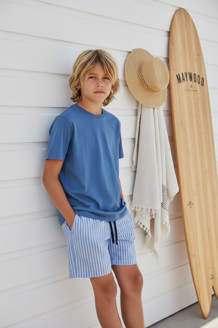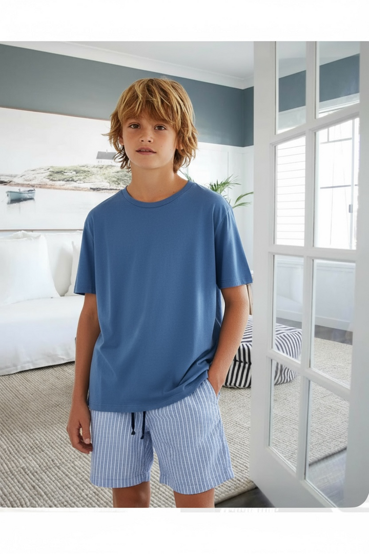 Pijama con remera de algodón pima 100% y short en genero del pima tambien A partir del talle 12, los shorts incluyen bolsillos. Perfectos para combinar padre e hijo con el mismo estilo.