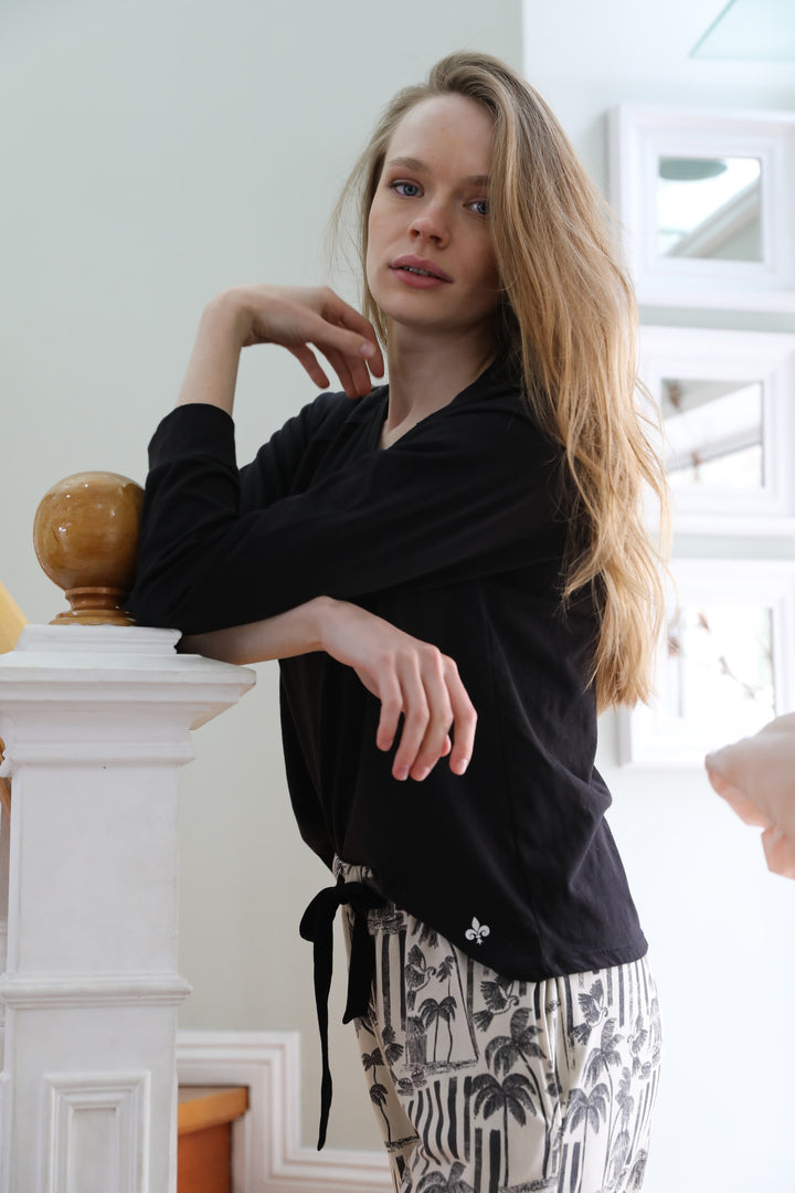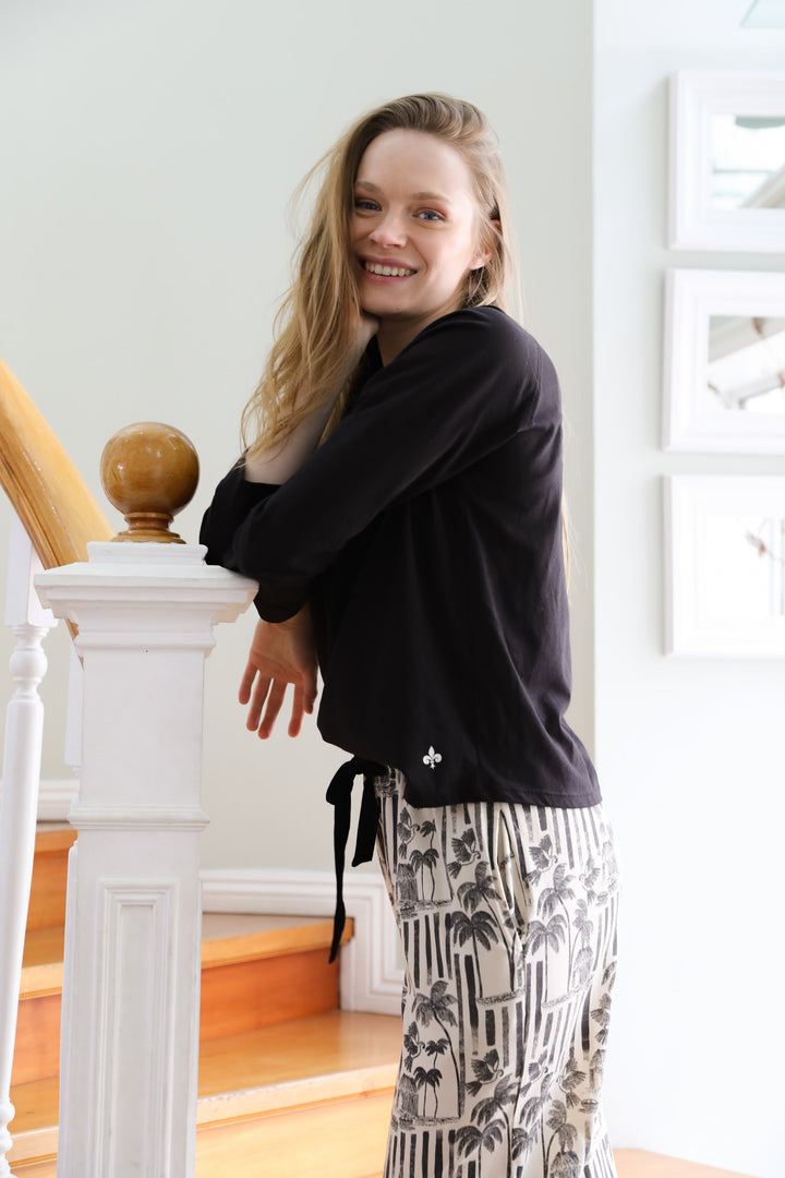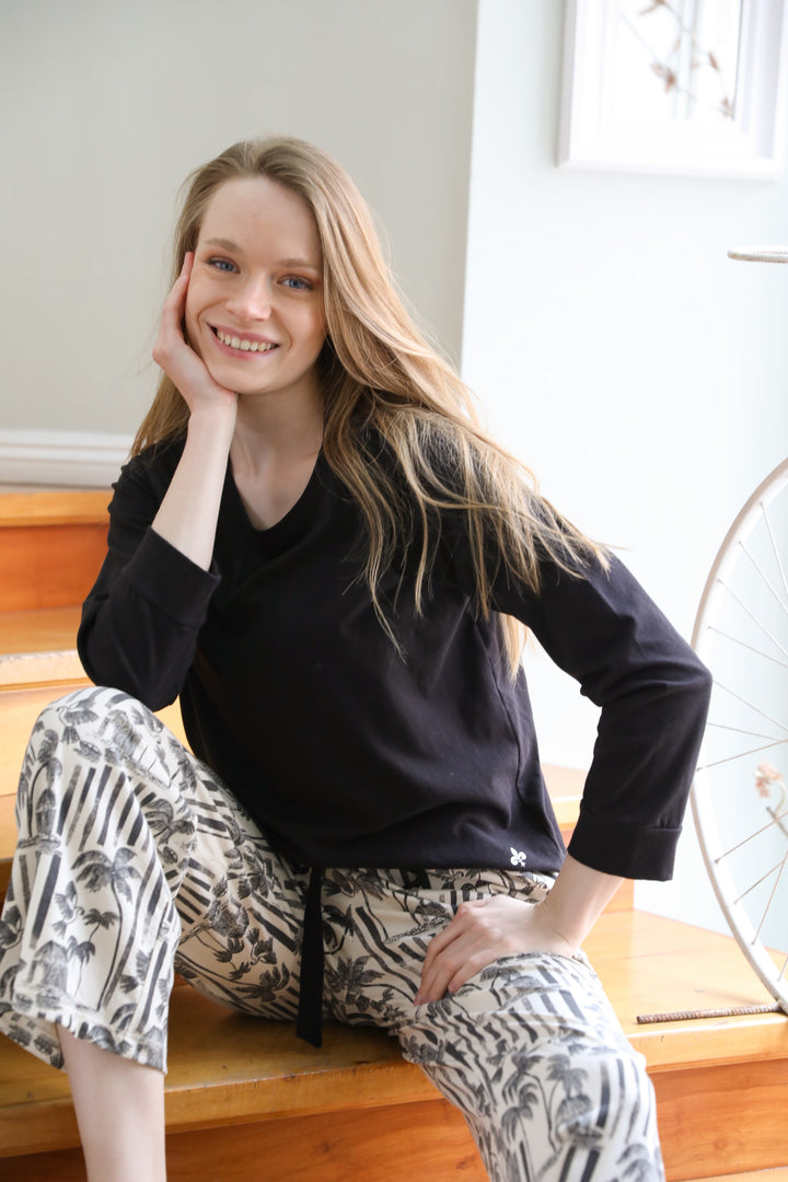 El pantalón en tono camel con estampado está diseñado con bolsillos funcionales, elástico y cordón en la cintura para un ajuste cómodo. La remera amplia proporciona una sensación muy cómoda al dormir