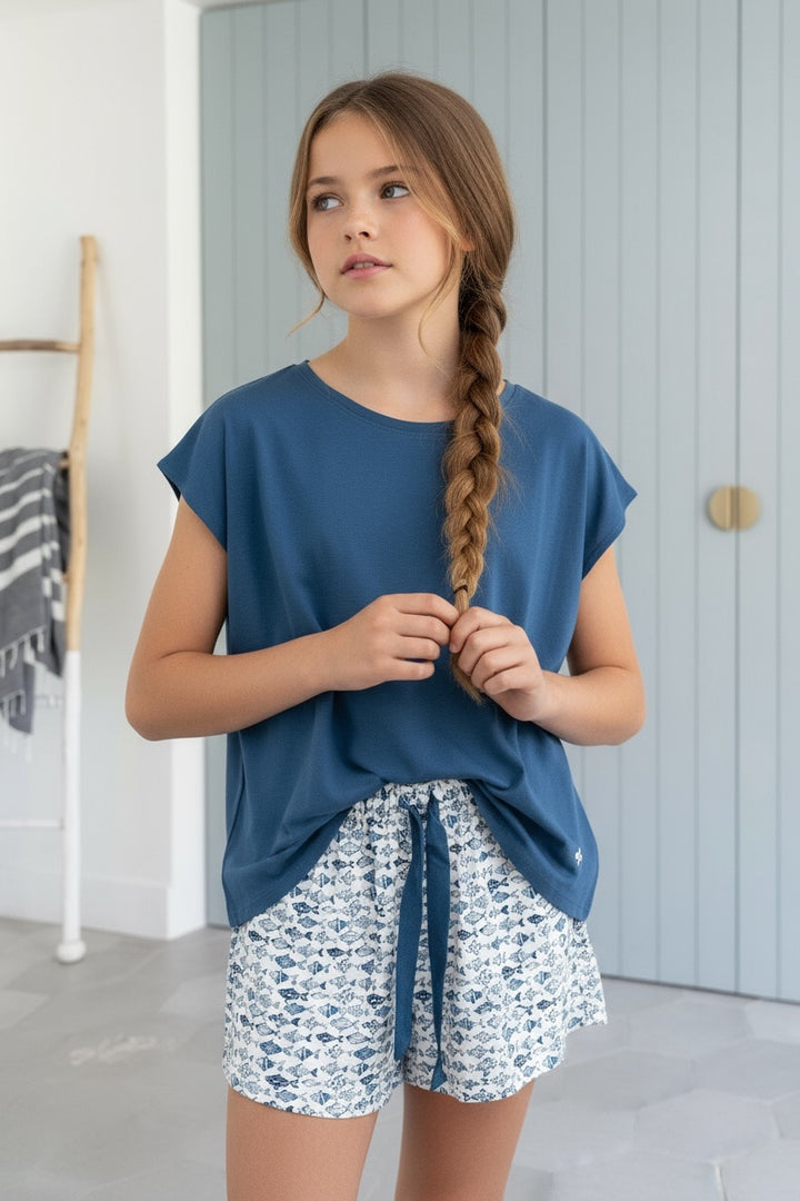 Pijama en algodón pima estampado, con short de bolsillos y elástico suave. La tela está prelavada, por lo que no se encoge.
