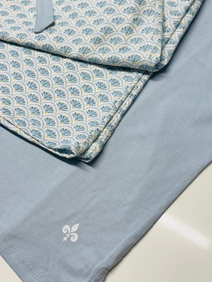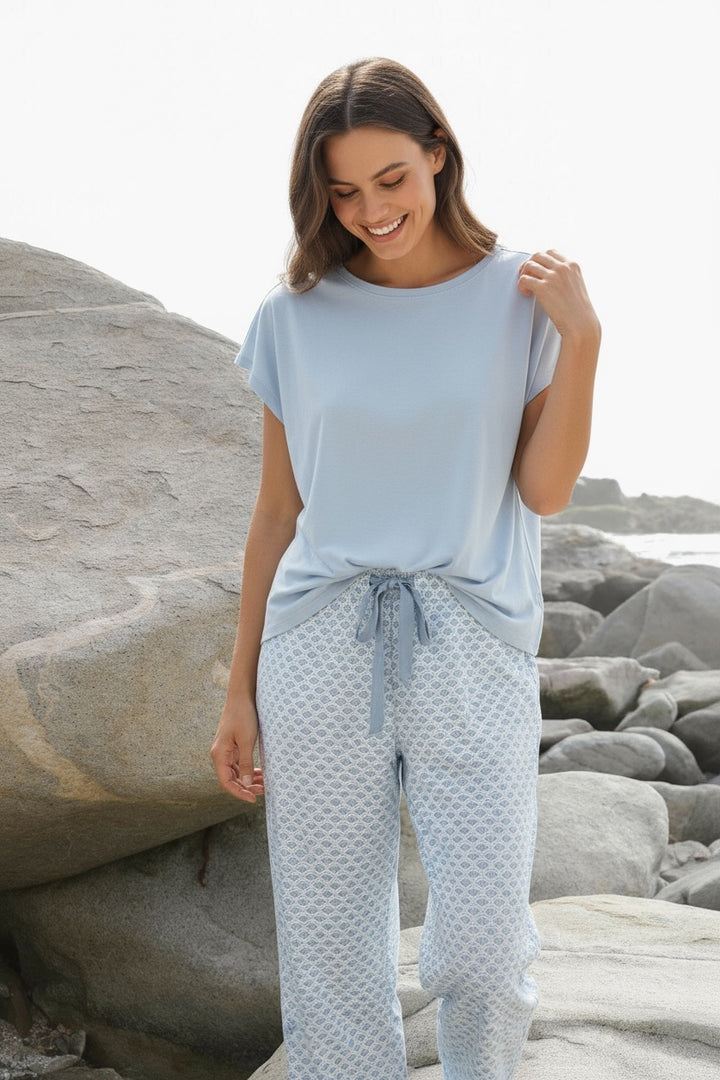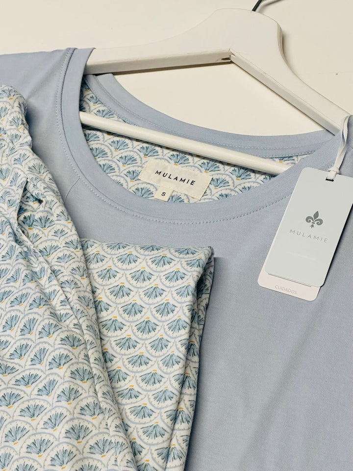 Pijama en algodón pima, con pantalón largo de bolsillos y elástico suave y polera de manga corta. De moldería amplia, cómodo e ideal para todo el año. Está prelavado, por lo que no se encoge