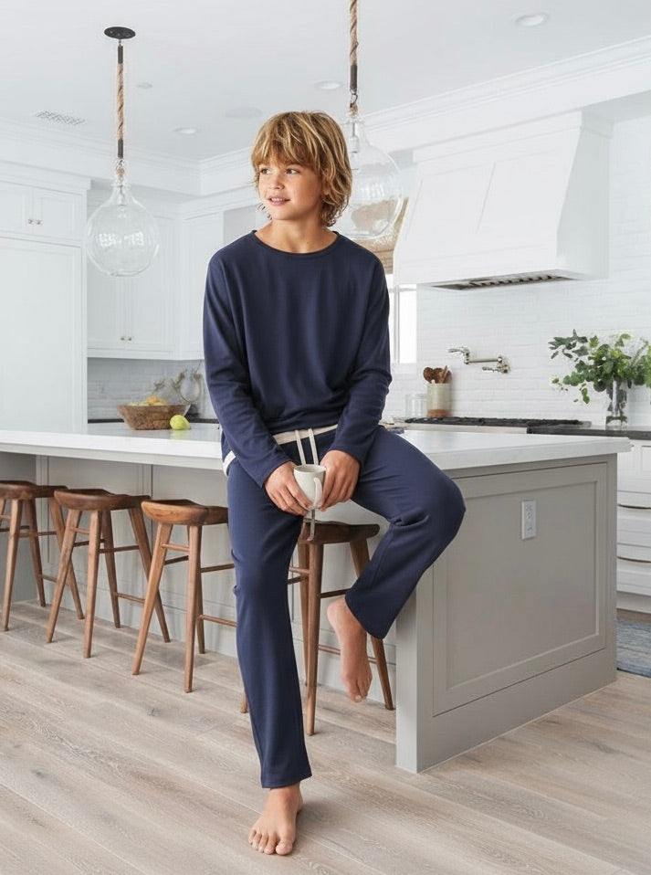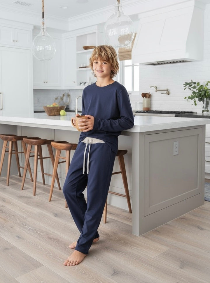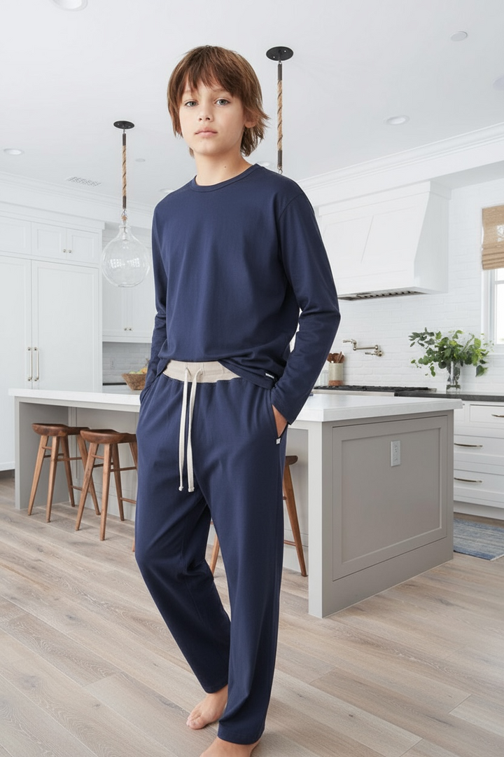 Este pijama básico de algodón pima peruano es la opción perfecta para los más jóvenes. Su pantalón cuenta con bolsillos, cordón y elástico en la cintura para un ajuste cómodo y práctico. Un básico imprescindible para cualquier guardarropa.