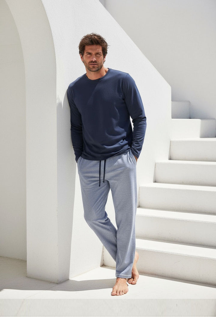 Pijama en algodón pima La Tshirt es jersey Pima en manga larga. La marca esta estampada, no tiene etiqueta. El pantalón es un algodon mas grueso rayada azul y blanca con la cintura con elástico celeste y su cordón azul navy haciendo juego con el color de los detalles del Tshirt.