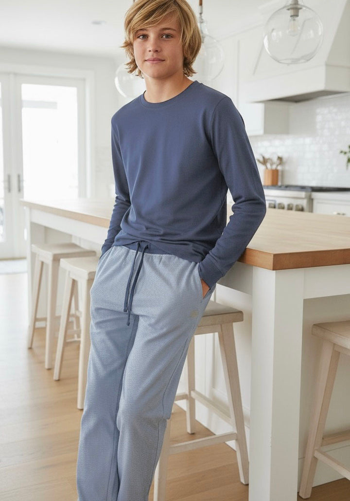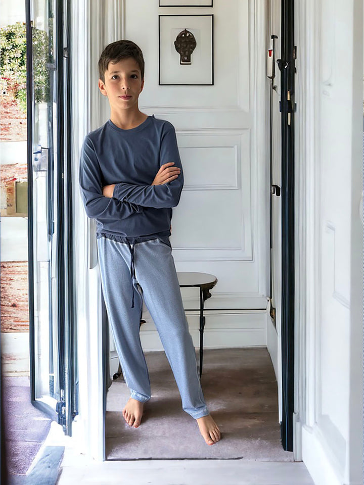 Pijama en algodón pima La Tshirt es jersey Pima en manga larga. La marca esta estampada, no tiene etiqueta. El pantalón es de Gamuza rayada azul y blanca con la cintura con elástico celeste y su cordón azul navy haciendo juego con el color de los detalles del Tshirt.