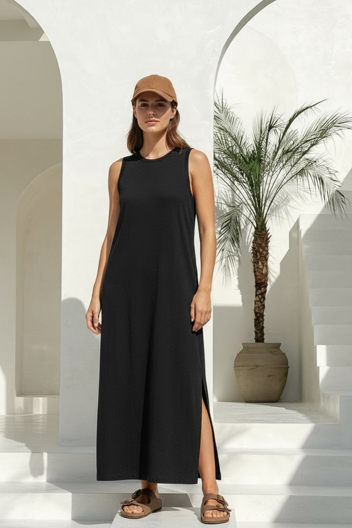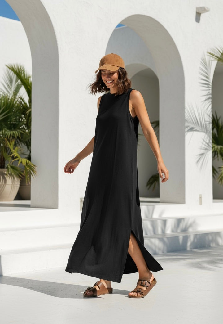 Vestido largo en flame de algodón pima, liviano y suave. Con dos tajos laterales que aportan movimiento y frescura.