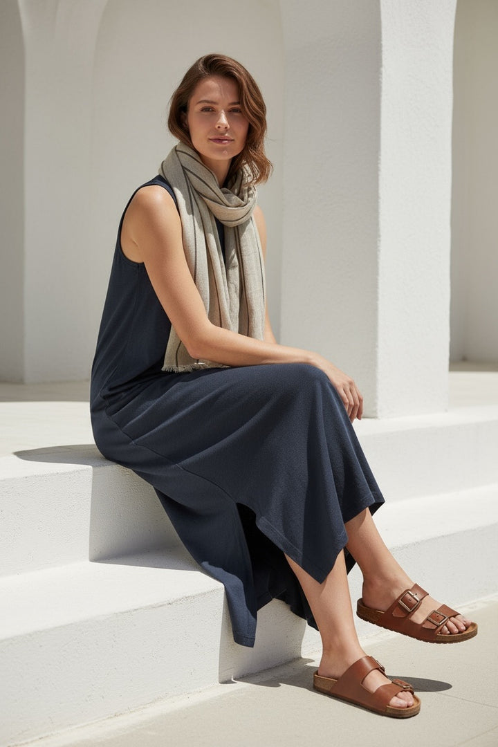 Vestido largo en flame de algodón pima, liviano y suave. Con dos tajos laterales que aportan movimiento y frescura.